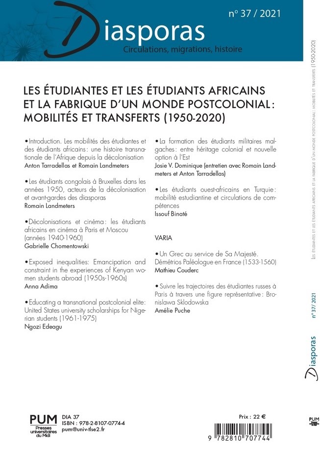 La construction des savoirs et des pratiques scientifiques, culturels ou politiques en Afrique fut, depuis l’Antiquité, intimement liée aux mobilités pour études. Les étudiant·e·s elleux-mêmes ont joué un rôle souvent décisif dans le dialogue sans cesse redéfini entre l’Afrique et le reste du monde. Ce fut particulièrement le cas à partir de la décolonisation, lorsque des étudiant·e·s ont été envoyé·es en nombre se former hors du continent dans l’espoir de devenir les nouvelles élites de l’Afrique postcoloniale. L’objectif de ce dossier thématique est, d’une part, de mettre en lumière le rôle qu’ont joués ces étudiant·e·s en migration dans la construction et l’évolution des États et sociétés africaines. Il vise d’autre part à évaluer quels impacts leurs mobilités ont eu sur les relations souvent complexes entre l’Afrique et le reste du monde depuis les années 1950, dans le triple contexte de la décolonisation, de la guerre froide et de la mondialisation.